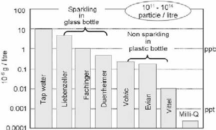 Number density (particles per liter water) varies from 10